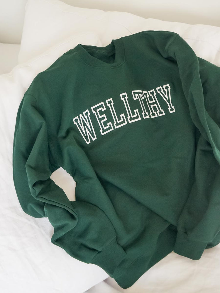 Wear your values in this embroidered "WELLTHY" varsity sweatshirt that feels soft & lightweight for both relaxing at home or on the run.